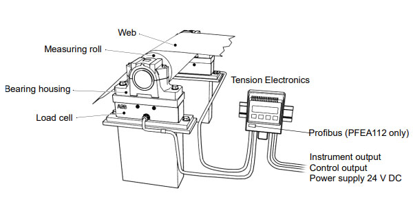 The equipment is intended for use in a wide range of manufacturing processes where a web of any kind of material, e.g. paper, plastic or textile, is transported in a machine. The only requirement is that the web is wrapped over a roll. The force on the roll is proportional to the web tension. The resulting force is transferred through the bearing housings into the load cells. The load cells create a signal that is proportional to the force acting in the measuring direction of the load cells. This signal is processed and amplified in the tension electronics and can be used as an input signal for process control, presentation on a display or for registration