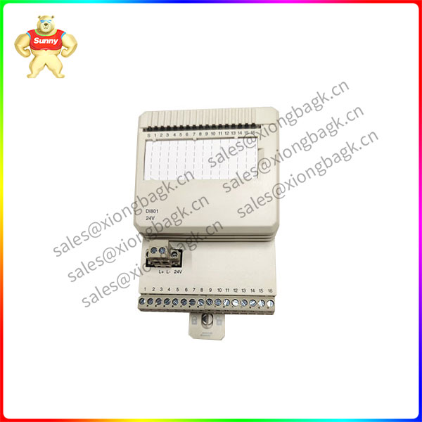 The DI801 is a 16 channel 24 V digital input module for the S800 I/O. This module has 16 digital inputs. The input voltage range is 18 to 30 volt d.c. and the input current is 6 mA at 24 V. The inputs are in one isolated group with sixteen channels and channel number sixteen can be used for voltage supervision input in the group. Every input channel consists of current limiting components, EMC protection components, input state indication LED and optical isolation barrier.