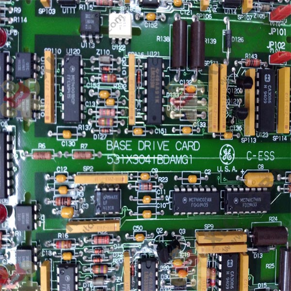 General Electric is the manufacture of the 531X304IBDAMG1 base driver circuit board. The 531X304IBDAMG1 is broken down into three sections. Each section looks identical to each other. They have the same number of diodes, resistors, condensers, integrated circuits, jumper pins, transistors, metal brackets, crystal oscillators, male terminal connection points, etc. Each component plays an important roll in the function of the circuit board. The integrated circuits also referred to by other names such as microchips, ICs or chips store data that controls the operation process of the circuit board. The diodes and jumper pins are used to direct the energy current.