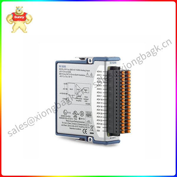 NI-9205 Plus or minus 10 V, 250 kS/s, 16, 32 channel C series voltage input module – NI ‑ 9205 executable single-ended or differential analog input, each has four programmable input range. With low price for the mold piece provides high channel number and high speed, is suitable for the economic type of multi-functional system. The module also provides four programmable input ranges. In order to prevent the transient signal, NI ‑ 9205 between the input channel and public provides up to 60 V over pressure protection. In addition, NI 9205 with dual channel of isolation barriers, to achieve the safe sex, interference resistance and high common-mode voltage range. It has instantaneous overvoltage protection of 1,000 Vrms.